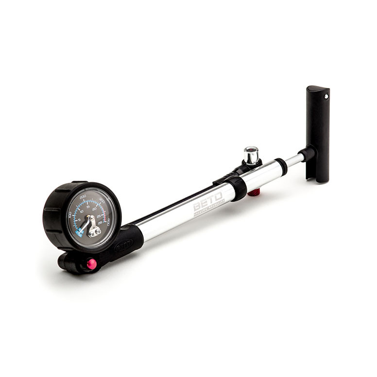 Алюминиевый насос высокого давления (до 27 атм,) с манометром и шлангом, для подкачки воздушных вилоки задних амортизаторов. Клапан для спускания воздуха при перекачки амортизатора. Алюминиевый корпус. Т-образная пластиковая ручка, поворотный резиновый шланг. Двухуровневая головка «без утечки воздуха». Максимальное давление 300 PSI